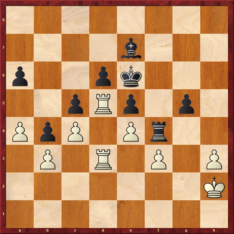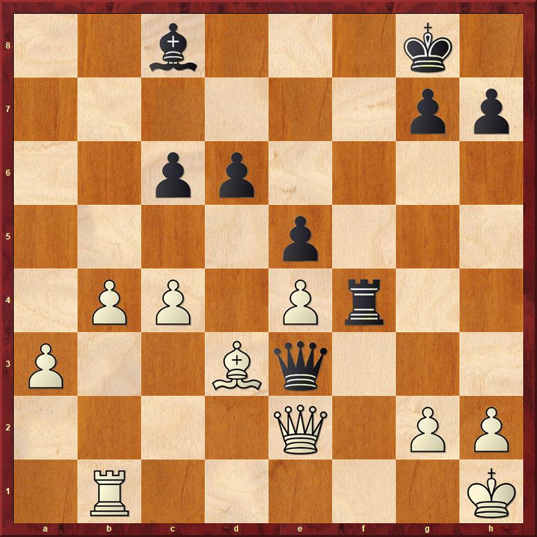 Jan van Garderen x Ineke Binnendijk, na 27. De2. Er volgde 27. … Txe4 28. Dxe3(?) Txe3 29. Td1(??) (doch Lc2 of Lf1 kost de pion op a3) Lg4 30. Tg1 Txd3 31. h3 Le6 en opgegeven.