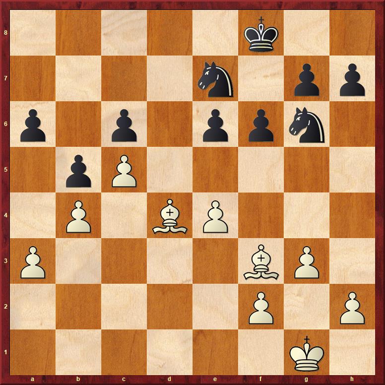 Hierna ging het snel. De wedstrijd was gelopen, de tegenstanders wilden naar huis en wij aan de drank. Aan het derde bord bood mijn opponent, toen mijn koningsaanval met zwart dreigde te verpieteren, op het tactisch meest juiste moment remise aan. Het evenwicht was de hele partij geen moment verbroken geweest. Ook Gijs had het nu, met zwart aan bord 1, wel gezien. Na een middenspel waarin beide spelers duizelig van de vele paardzetten moeten zijn geworden, resteerde een slot met ieder 7 pionnen, met twee lopers voor wit en twee paarden voor zwart. De theorie zegt nu dat het van de pionnenstructuur afhangt, wie er in het voordeel is, maar de heren hadden er geen behoefte meer aan elkaar dat te bewijzen. Ik geef de slotstand hier aan de hand van de partijnotatie van de Arbiter. Misschien iets voor de Kerstdagen? Wit is aan zet. Als er beslist doorgespeeld moet worden, wie heeft dan de meeste kans om te winnen, en wat is het plan in deze stelling voor beide spelers? Onderbouwde analyses graag op het Gastenboek. En natuurlijk gebruiken we daar geen engine bij!