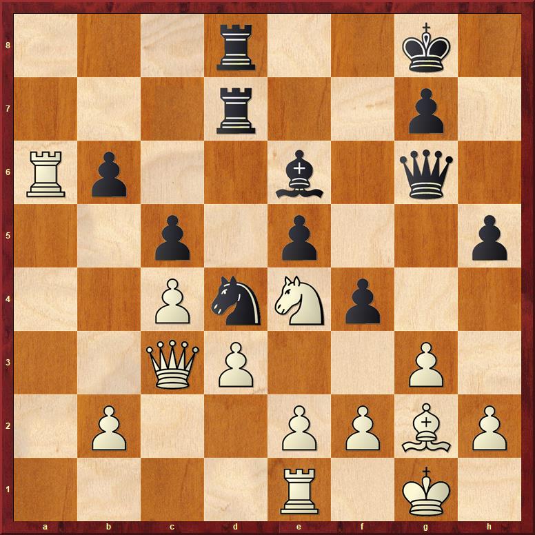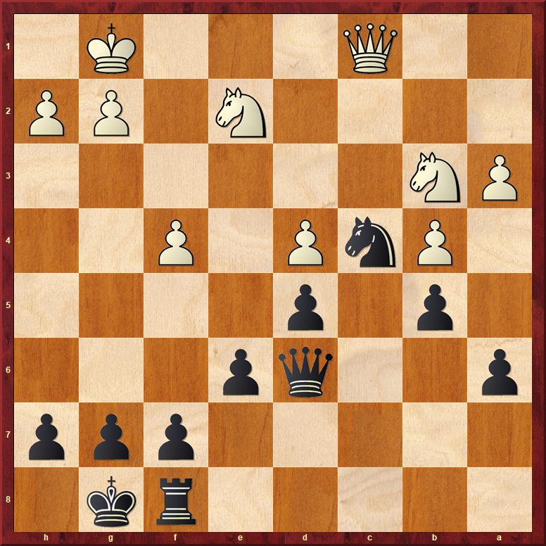 Er volgde: 28. … Pxe2†(?!?) 29. Txe2 Txd3 30. Ta8(?) Td1† 31. Te1 Txe1† 32. Dxe1 Txa8 33. Pf6† Dxf6 34. Lxa8 Lxc4 en zwart staat beter. Gewenst, maar erg moeilijk te overzien, was het haast gedwongen: 30. Td2 Txd2 31. Pxd2 en nu na bijv.Txd2 32. Dxd2 Db1† 33. Lf1 Lxc4 34. Ta8† Kh7 35. Ta1 Dxa1 36. Dc2† g6 37. Dxc4. Maar ook dan hadden de heren nog een hele kluif aan elkaar gehad (met dank aan Fritz).