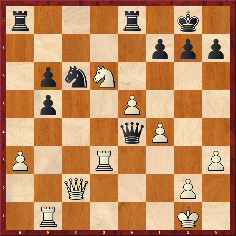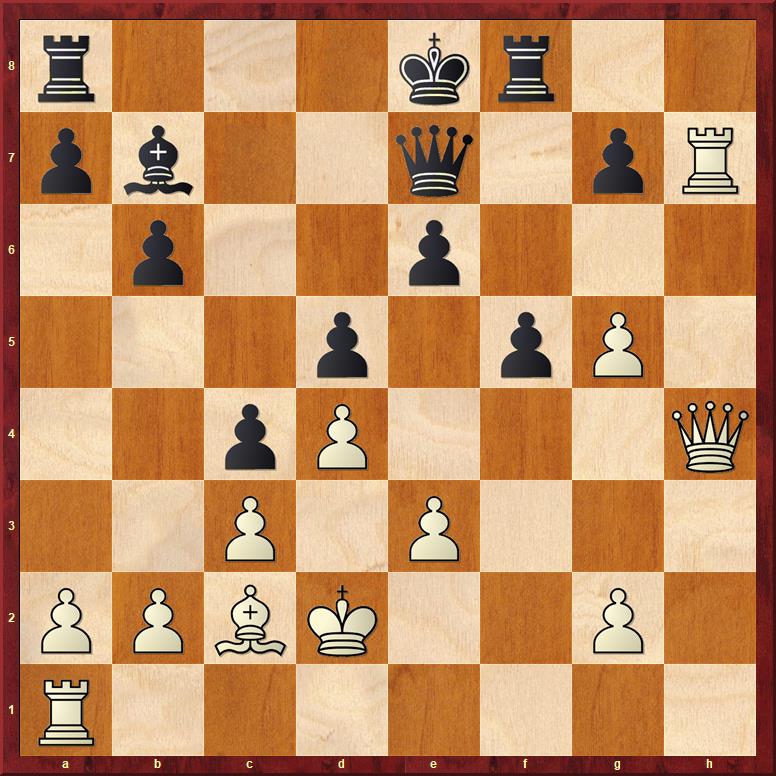 23. La4† Kd8 24. Th1 Kc7 25. Df4† Kc8? (beter, maar ook onvoldoende: e5) 26. De5! Tg8? 27. Th1-h6 Te8 28. Txg7 met het hierboven geschetste resultaat