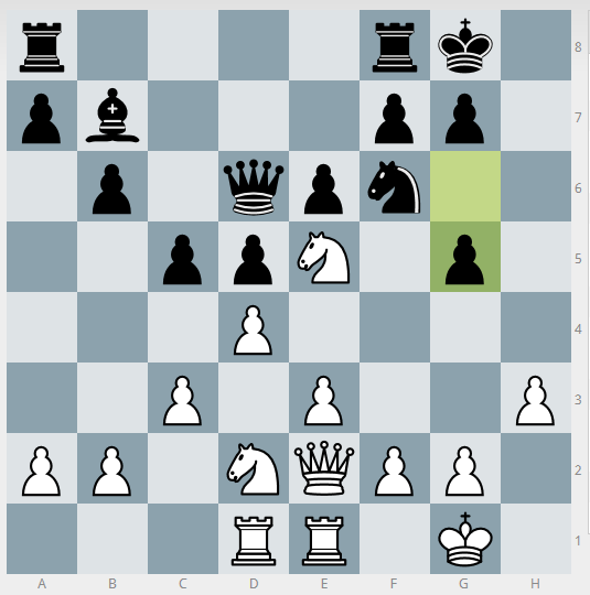 15. ... g5 Zo probeert zwart de witte steunzet f4 te voorkomen, omdat het witte paard op e5 anders wel erg sterk staat.