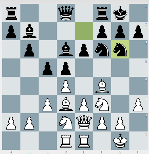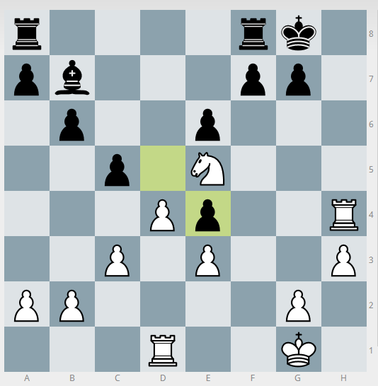 met tegenspel voor zwart op de damevleugel. Zwart kan nu niet op e3 slaan, omdat de witte aanval met de toren op f1 te sterk is.