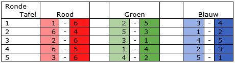 • Het poulevolgnummer (dat is het cijfer tussen vierkante haken achter de pouleletter) bepaalt in welke ronde tegen welk ander team gespeeld wordt. Hieronder staat per ronde welk poulevolgnummer aan welke kleur tafel speelt.