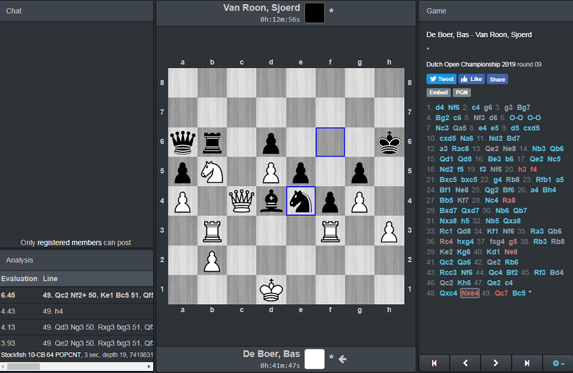 Wel grappig hoe die IM binnen tien zetten een eindspel in rent, met het idee "dat win ik wel op rating". Vervolgens erachter komt dat zijn paard nooit de ideale opstelling kan bereiken i.v.m. problemen op de d-lijn, dan maar torens ruilt en volhardt in verliespogingen. Exemplarisch voor ZSG - als we winnen in die open groep brallen we heel veel (logisch); als we verliezen bralt Fred vooral heel veel. |