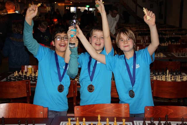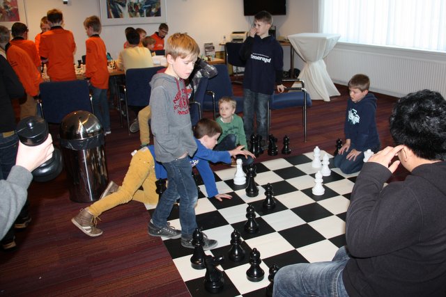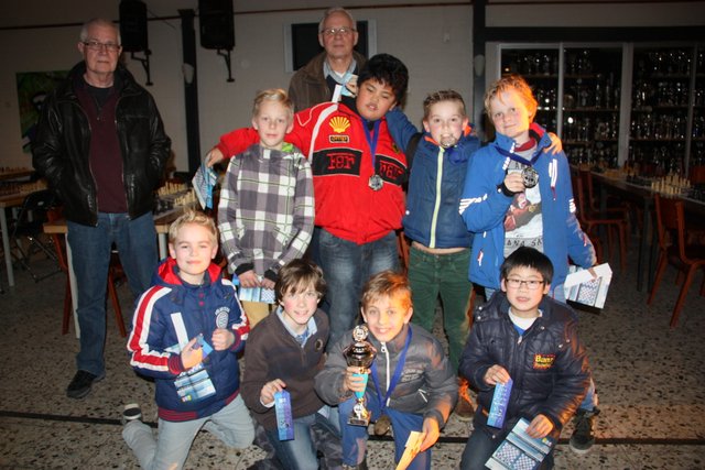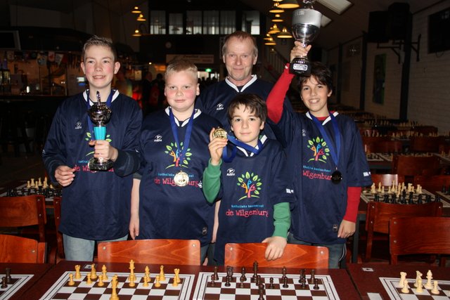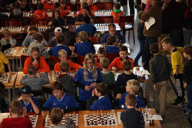 Om half twee hadden alle deelnemers de juiste stoel gevonden. Na het openingswoord van jeugdleider Arjan de Vries barstte het strijdgeweld los tussen de 46 teams. Al snel volgde de eerste vreugdekreten en teleurgestelde blikken. Andere spelers hadden het volledige half uur nodig om een partij te beslissen. De teams werkten in één van de 12 poules de eerste drie rondes af. De indeling van de poules was tot stand gekomen via een loting. Na deze eerste 3 rondes volgde nog 3 rondes waarbij rekening gehouden werd met de eerder behaalde resultaten. Tja en die eerdere resultaten gaven geen garantie, maar wel een hele goede uitgangspositie voor Wilgenburg 1 (met 12 punten), Wilgenburg 2 (met 11,5 punten) met daar vlak achter Montessorischool 1 en Van Heemstraschool 1 (met 11 punten) en daar weer achter Schatkamer 1 en Van Heemstraschool 2 (met beide 10 punten). Deze scholen namen uiteindelijk ook het erepodium voor hun rekening. De voorsprong van Wilgenburg 1 werd niet meer uit handen gegeven. Met 22,5 punten (dat zijn maar 1,5 verliespunt) werd Wilgenburg 1 de duidelijke kampioen.