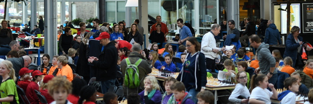 Volgens de laatste telling doen er inclusief wisselspelers 323 kinderen mee. Gezellig! In de schaakarena staan in totaal 156 wedstrijdborden schaakklaar, zodat alle 73 teams van 26 verschllende scholen gelijktijdig hun wedstrijd kunnen spelen. Het is best even zoeken om het juiste schaakbord te vinden. Dat is geen kwestie van zomaar achter het eerste het beste schaakbord gaan zitten.