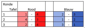 • Het poulevolgnummer (dat is het cijfer tussen vierkante haken achter de pouleletter) bepaalt in welke ronde tegen welk ander team gespeeld wordt. Hieronder staat per ronde welk poulevolgnummer aan welke kleur tafel speelt.