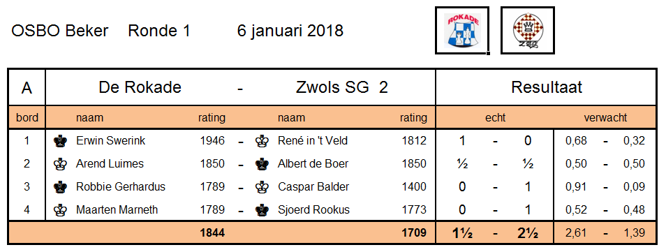 Toen ik klaar was leek de einduitslag me eigenlijk al wel bekend: Caspar stond straal verloren en René pot remise. 2-2 en vluggeren dus. Op zich geen slechte uitslag en bij het vluggeren zou 2-2 voldoende zijn aangezien onze winstpartij op bord 1 was. Daarnaast wordt er bij ZSG volgens mij toch wel bovengemiddeld veel gevluggerd na de lange partijen en leken onze tegenstanders gemiddeld toch wel een paar jaartjes ouder. Al met al had ik (en Albert volgens mij ook wel) behoorlijk wat vertrouwen in een goede afloop.